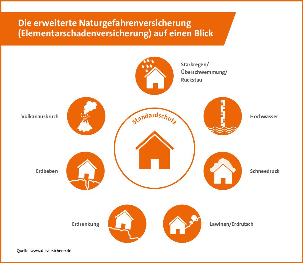 Für Schäden, die durch die vier Elemente entstanden sind, gibt es die sogenannte Elementarschadenversicherung. Eine Elementarschadenversicherung bietet sich für Menschen an, die in eher gefährdeten Gebieten leben oder wenn Elementarschäden in einem Gebiet Hochwasser, Lawinen, Erdbeben, oder Stürme häufig vorkommen. Die Gefährdungsstufe einer Region reicht von Stufe 1 (kaum gefährdet) bis Stufe 4 (sehr gefährdet). Von der Gefahrenstufe abhängig ist auch die Versicherungssumme und die Prämie.