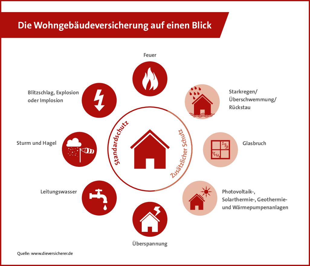 Die Wohngebäudeversicherung beinhaltet in der Regel die Feuerversicherung, die Leitungswasserversicherung und die Stromversicherung. Somit sind die meisten möglichen Schadensursachen abgedeckt. Der Beitrag der Wohngebäudeversicherung hängt von mehreren Faktoren ab. Dieses sind neben des gewählten Leistungsumfangs zum Beispiel die Lage der Immobilie, die Wohnfläche und das Baujahr.